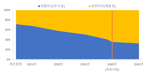 – 설정 초기 시점에는 국내외 주식 및 대체관련 자산에 대한 투자 비중을 확대하여 수익률 제고와 노후자금 축적을 중심으로 운용하고, 목표시점이 가까질수록 채권 등 안전자산과 인컴수익 발생 자산의 비중을 점진적으로 확대하여 안정성을 중심으로 운용할 계획